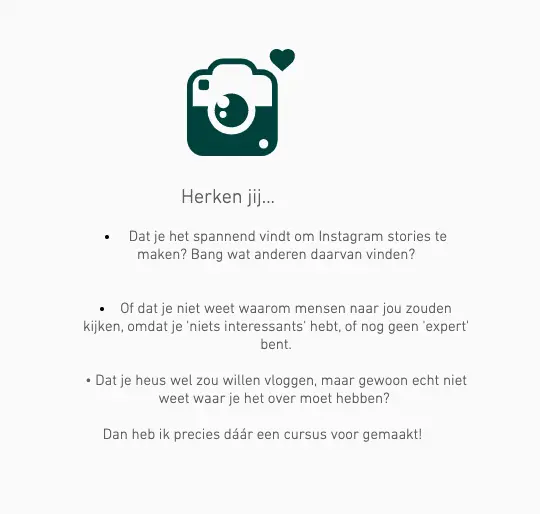 Een ander leuk voorbeeld is onderstaande tekst op de salespagina voor de Instagram cursus ‘long story short’ van Charlotte van ‘t Wout: