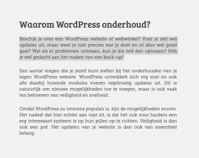 In de gearceerde tekst hieronder van tussendoor.nl probeert het bedrijf de aandacht van de doelgroep te trekken.