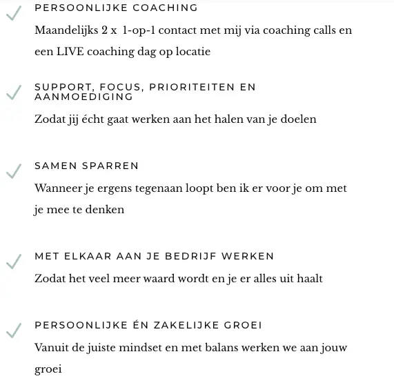 Marlou.nl doet dit overzichtelijk voor één van haar trajecten met een opsomming van de inhoud: